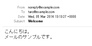 class Hello < ActionMailer::Base default from: "from@example.com" def welcome mail(from: 'noreply@example.com', to: 'taro@example.com') end end |