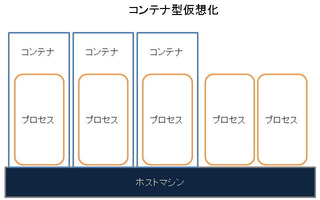 コンテナ型仮想化の図で、コンテナ内で動いていないプロセスがあります。これは普通のプロセスとコンテナ内で実行するプロセスが同じホストマシン上に同居していることを表しています。