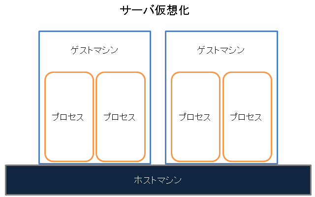 サーバ仮想化ではホストマシン上でゲストマシンが動き、ゲストマシン内で様々なプロセスが動きます。一方のコンテナ型の仮想化では、ホスト OS 上にコンテナという隔離された空間が作成され、その中でプロセスが実行されます。