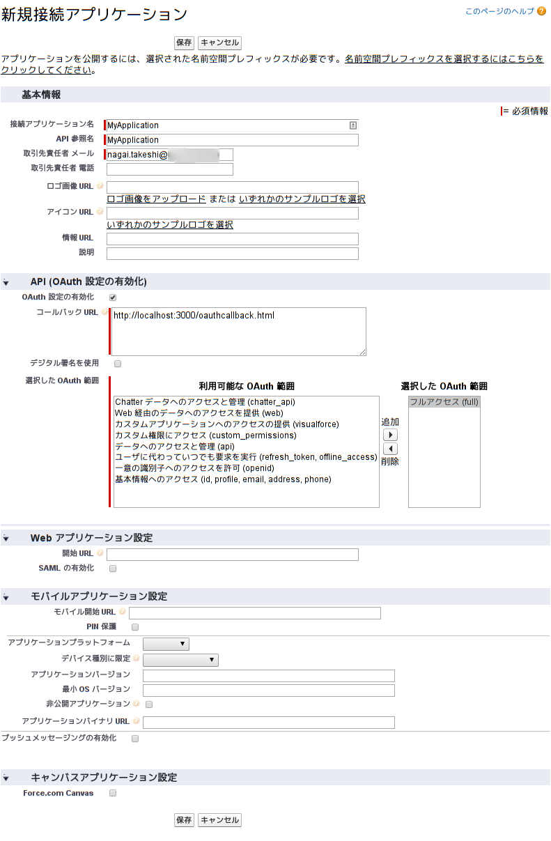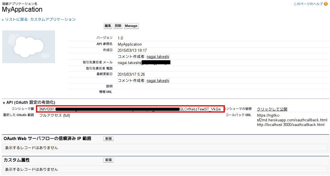作成済みの「接続アプリケーション名」の横の「編集」ボタンをクリックして編集画面をひらき、「コールバックURL」に「https://xxxMyApplication.herokuapp.com/oauthcallback.html」("xxxMyApplication"はアプリケーション名)を追加します。