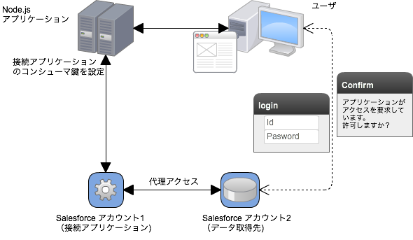 次の図は今回作成するNode.jsアプリケーションとSalesforceの代理アクセスの処理をまとめたものです。