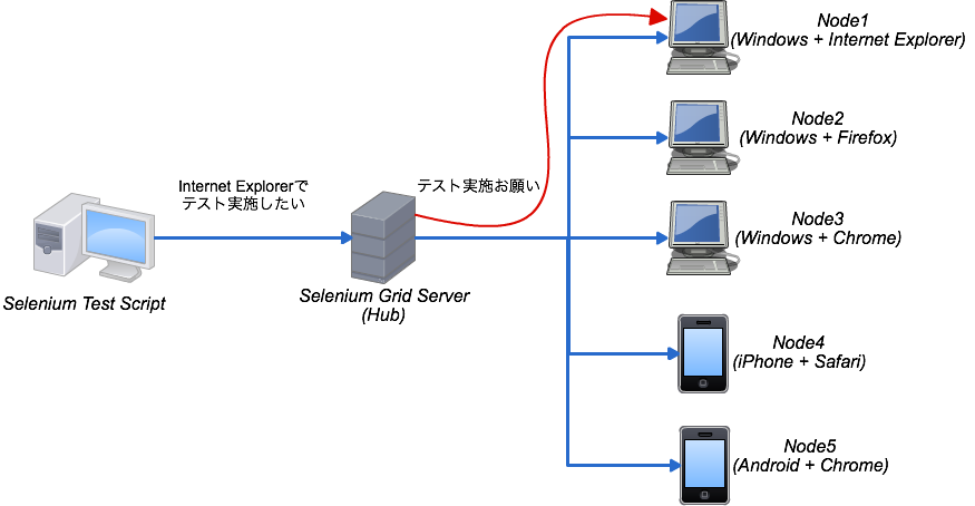 Selenium Grid Server(Hub)が登録されているNodeの中から適切なNodeに対して処理を振り分けする、という流れになります。
