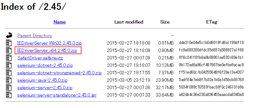 Chrome、Internet Explorerでテストをしたい場合は、それぞれドライバをselenium-server-standalone-2.45.0.jarと同じディレクトリにダウンロードします。