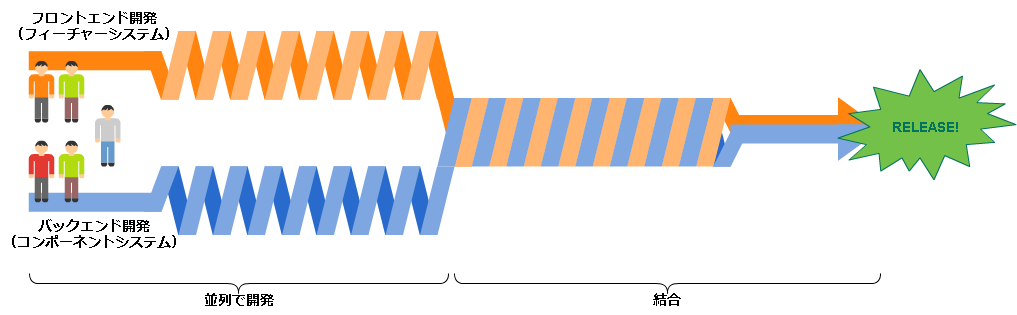 先述した通りフロントエンド開発にはそれなりに時間がかかります。バックエンド開発もまた、高度な要求を実現するために多くの時間を必要とします。これら二つの開発の進行を直列に並べてしまうと、工期が長くなり過ぎるという問題がありました。