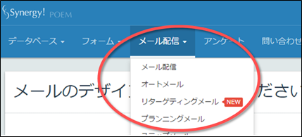 上のキャプチャ画像は Synergy! のメール配信メニューを展開したものです。「New」マークがついた「リターゲティングメール」が新しく追加された機能で、「オートメール」「プランニングメール」などが既存機能です。「リターゲティングメール」には、前述した既存機能と同様の機能のリニューアル版も内包されていて、お客様はどれでも使うことができます。