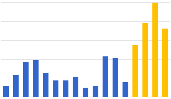 下のグラフは、直近数年における機能追加および機能改善に関する単位期間ごとのリリース数を時系列に並べたグラフです。グラフの黄色い範囲が本プロジェクトの成果です。