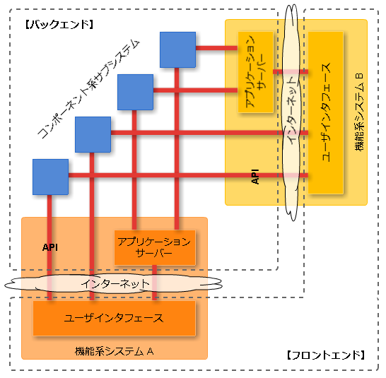 最近では、チームごとのプロジェクトの独立性を更に向上させるため機能単位でのサブシステム化も行われています。機能単位のサブシステムは、フロントエンド(ユーザインタフェース)まわりを中心としたシステムで、そのバックエンドはコンポーネント単位のサブシステムに REST API や WebSocket などでつなげています。最近は JavaScript のライブラリやフレームワークも充実していて、こういったことが以前より簡単に実現できます。