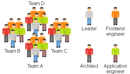 そこで採用したのが、それまでの開発組織を複数の小チームに分割することでした。メンバーは 5 名前後で構成し、固定です。各チームには、チーム運営に責任を持つリーダーと、技術面に責任を持つアーキテクトを配置し、必要な権限をチームが持ちます。チーム運営には特に決まったルールはなく、各々の自主性に任されています。