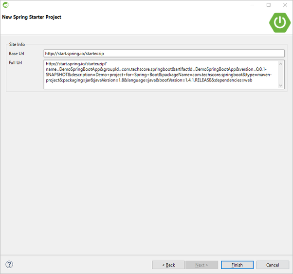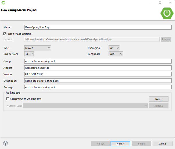 Group は「com.techscore.springboot」、Artifact は「DemoSpringBootApp」、Package は「com.techscore.springboot」とします。