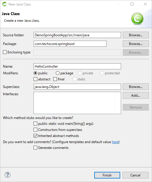 Finish ボタンをクリックすると、「HelloController」の作成が完了します。