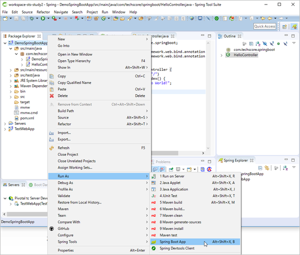 プロジェクト「DemoSpringBootApp」を右クリックし、Run As > Spring Boot App をクリック。