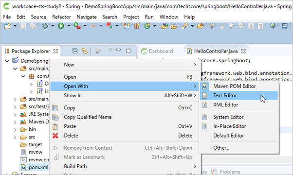 DemoSpringBootApp プロジェクトの直下にある「pom.xml」を右クリックし、Open With > Text Editor をクリック。
