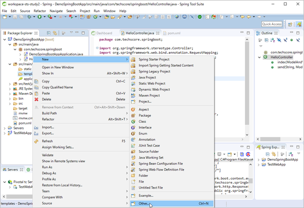 パッケージエクスプローラで「src/main/resources」配下にある「templates」フォルダを選択して右クリックし、New > Other… をクリック。