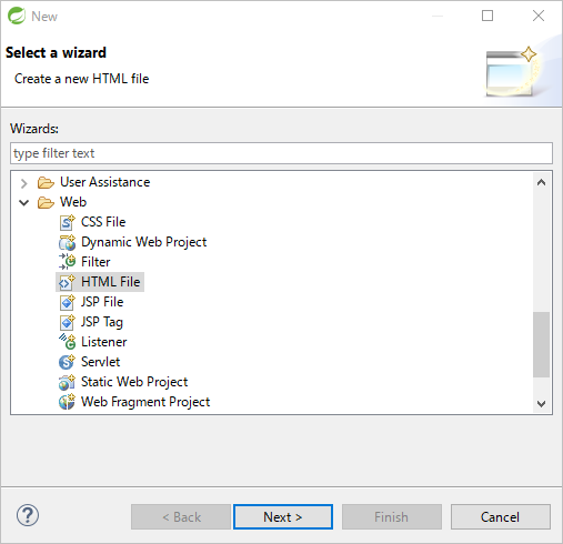 「Web」内の「HTML File」を選択して Next ボタンをクリック。