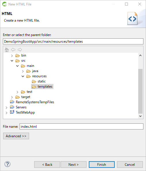 保存場所は「templates」フォルダを選択。ファイル名は「index.html」を入力して Next ボタンをクリック。
