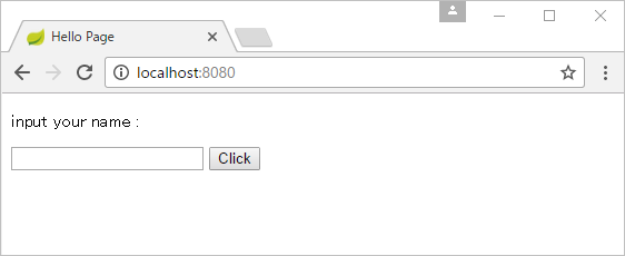 <!DOCTYPE html> <html> <head> <meta http-equiv="Content-Type" content="text/html; charset=UTF-8" /> <title>Hello Page</title> </head> <body> <p th:text="${msg}">please wait...</p> <form method="post" action="/"> <input type="text" name="name" th:value="${value}" /> <input type="submit" value="Click" /> </form> </body> </html> |