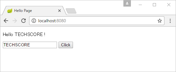 入力テキスト欄に入力してボタンをクリックすると、コントローラで追加したテキストとあわせて「Hello ”入力値” !」が表示されました。