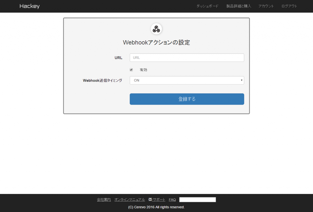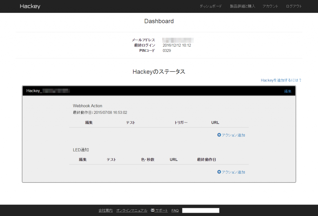 Webhookの設定はMy Hackeyのダッシュボードにて行います。ダッシュボードにログインすると、My Hackeyアカウントに紐付けられているHackeyの設定状態が表示されます。スクリーンショットではモザイクをかけていますが、「Hackey_」の後の文字列がHackeyのデバイスIDです。