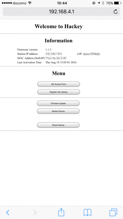 - Hackeyにブラウザからアクセスし、「Set Accerss Point」からHackeyがインターネットに接続する際に使用するWi-Fiアクセスポイントを登録する。