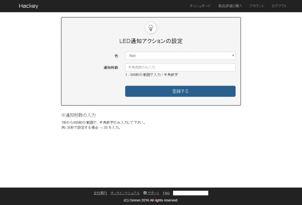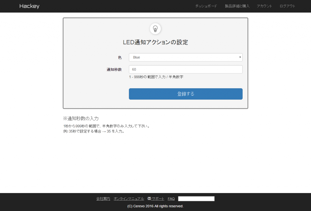 ここではLEDインジケーターを「何色」に「何秒間」光らせるかを設定します。色は「Red」「Green」「Blue」「Yellow」「Purple」から選択できます。試しに「60秒間青色に光らせる」URLを発行してみます。