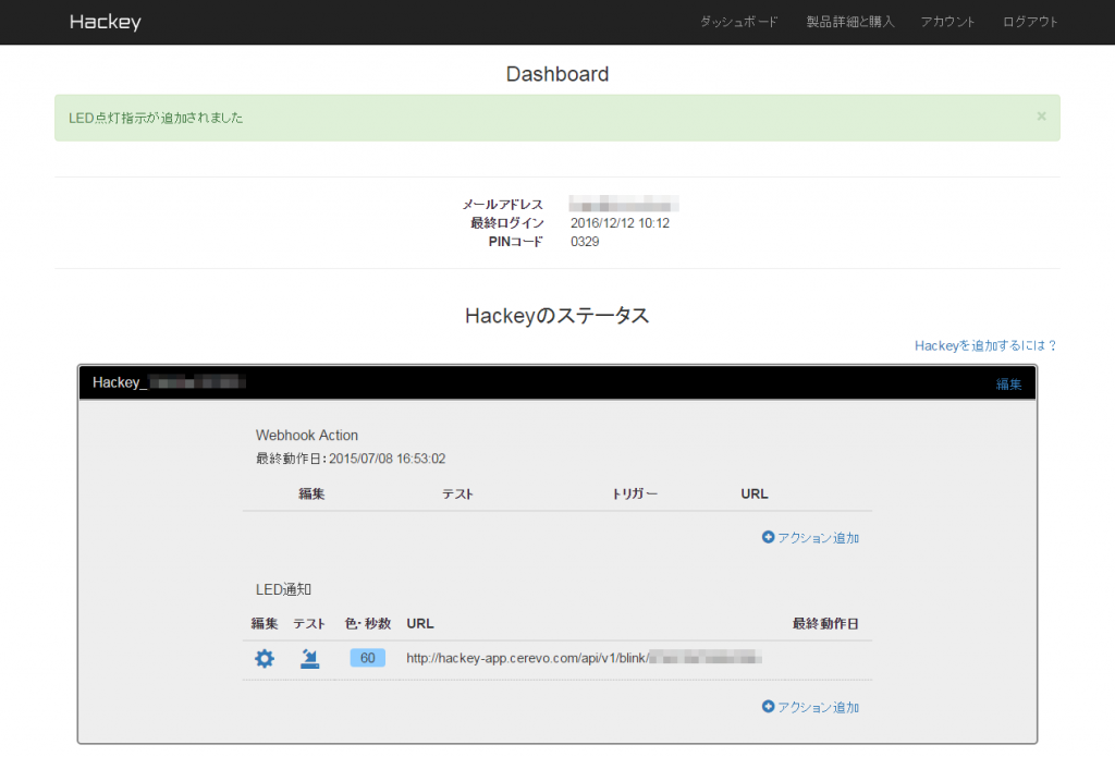 ここで表示されているURLにGETでHTTPリクエストを送信すると、HackeyのLEDインジケーターは60秒間青く光ります。「テスト」をクリックすると、実際の動きを試してみることができます。