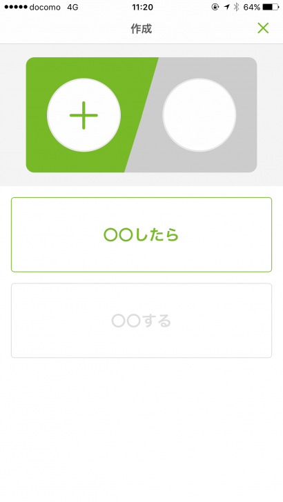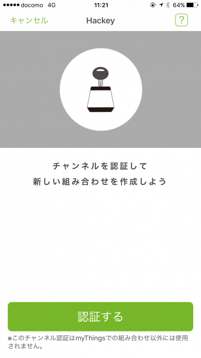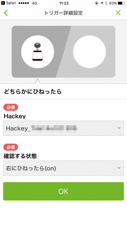 最初にトリガーの部分「○○したら」を設定します。タップするとMyThingsが対応しているWebサービスやIoTデバイスの一覧が表示されますから、ここからHackeyを選択します。はじめてMyThingsでHackeyを利用する時は、My Hackeyアカウントの認証が入ります。次のように設定すれば、トリガーの作成は完了です。