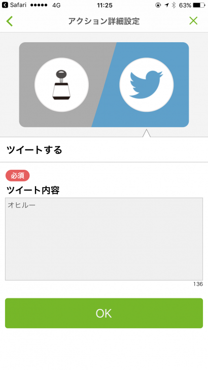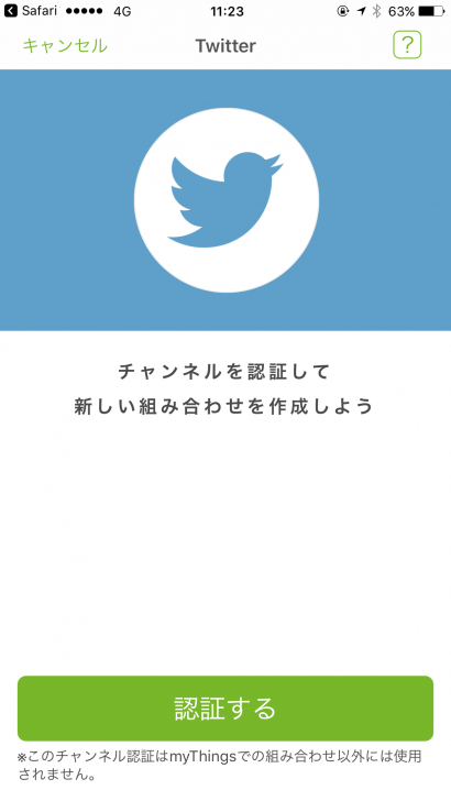 続いて、アクションの部分「○○する」を設定します。タップすると先ほどと同様にWebサービスやIoTデバイスの一覧が表示されますから、ここからTwitterを選択します。はじめてMyThingsでTwitterを利用する時は、Twitterの認証が入ります。次のように設定すれば、アクションの作成は完了です。