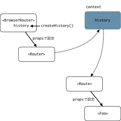 historyの生成、受け渡しの流れを図に表すとこんな感じでしょうか。contextを経由することで直接関係のないコンポーネントにhistoryを渡しています。
