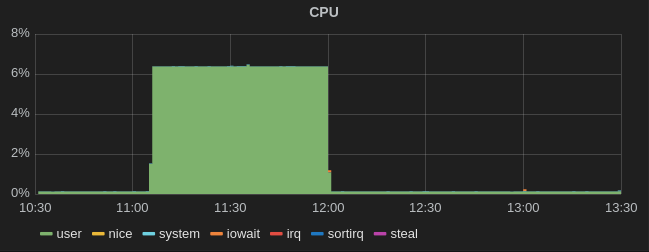 バッチサーバのように、ある時間帯だけ一定の CPU 負荷がかかるようなサーバを運用していると、Load Average のグラフがこんな形になるのをよく見かけます。