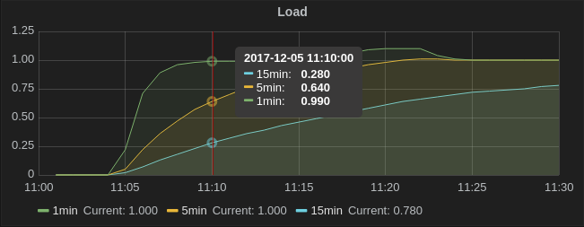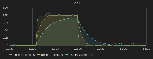 このグラフは CentOS 6 (Kernel 2.6.32-696.16.1.el6.x86_64) のサーバで 11:05 から 12:00 までの間、CPU 1コア占有する負荷をかけたときのものです。3本の折れ線グラフはそれぞれ過去 1, 5, 15分間の平均負荷です。平均をとる期間が長くなるほどグラフの立ち上がり・立ち下がりが緩やかになる様子が見てとれます。