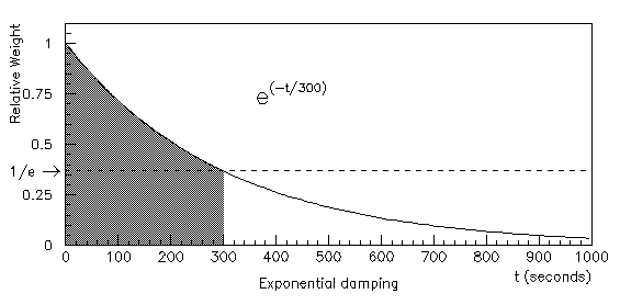 実はこれ、平均をとる期間(1, 5, 15分)で 1/e に減衰する指数関数で過去データを重み付けして平均をとるのと同じ意味になります。例えば、5分で 1/e に減衰する指数関数は下図のような曲線を描きます。横軸は経過時間です。
