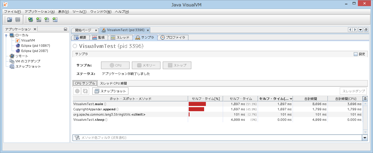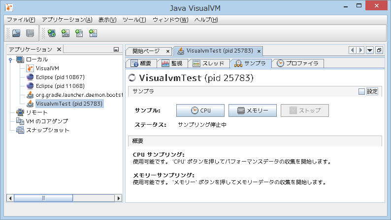 サンプルプログラムを起動して jvisualvm を見てみます。すると、左側の「アプリケーション」にプロセスが表示されますのでダブルクリックで開きます。