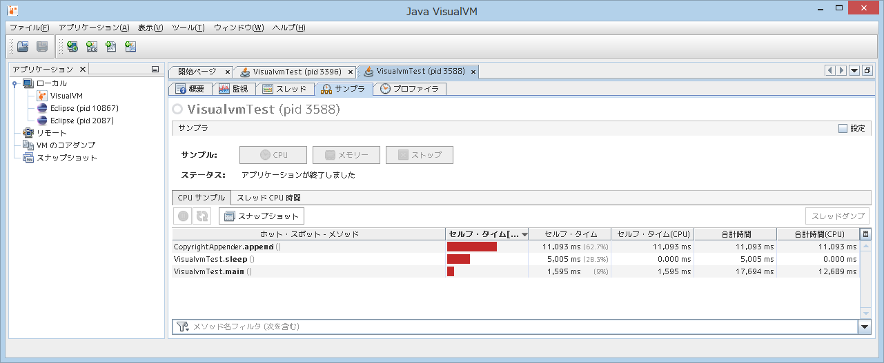 一方、CopyrightAppender.append() は、「セルフ・タイム」=「セルフ・タイム(CPU)」になっており、CPU をフルに使った処理になっていることがわかります。