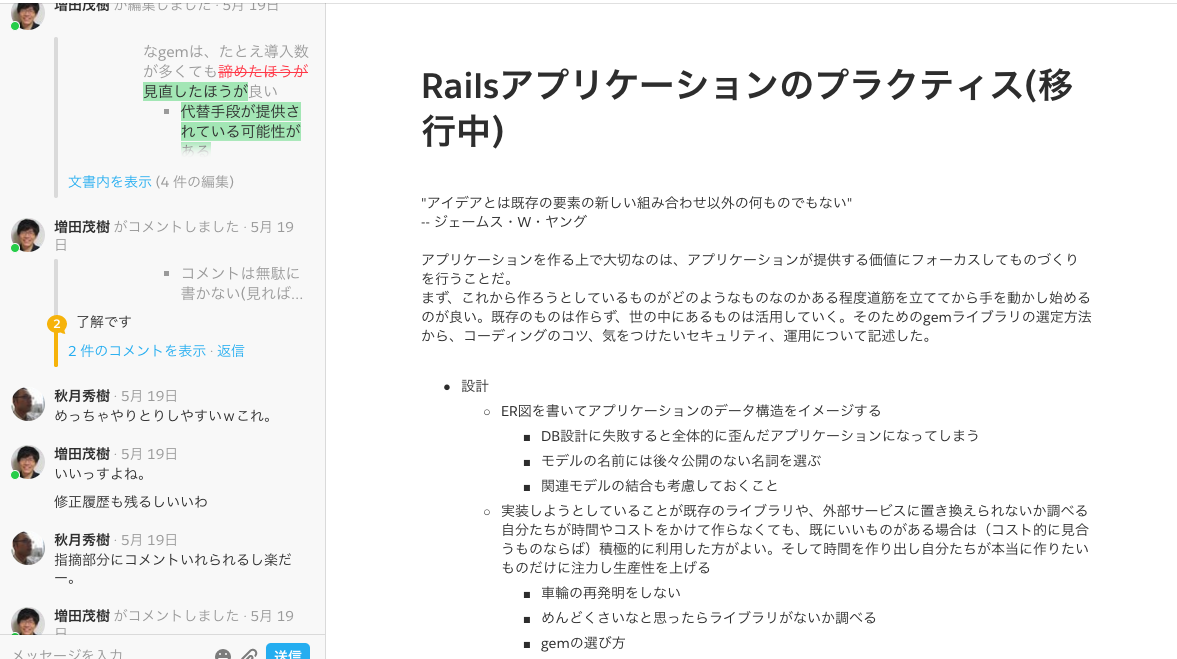 文章にコメントした内容が、タイムラインとして残るので校正作業がとてもはかどりました。