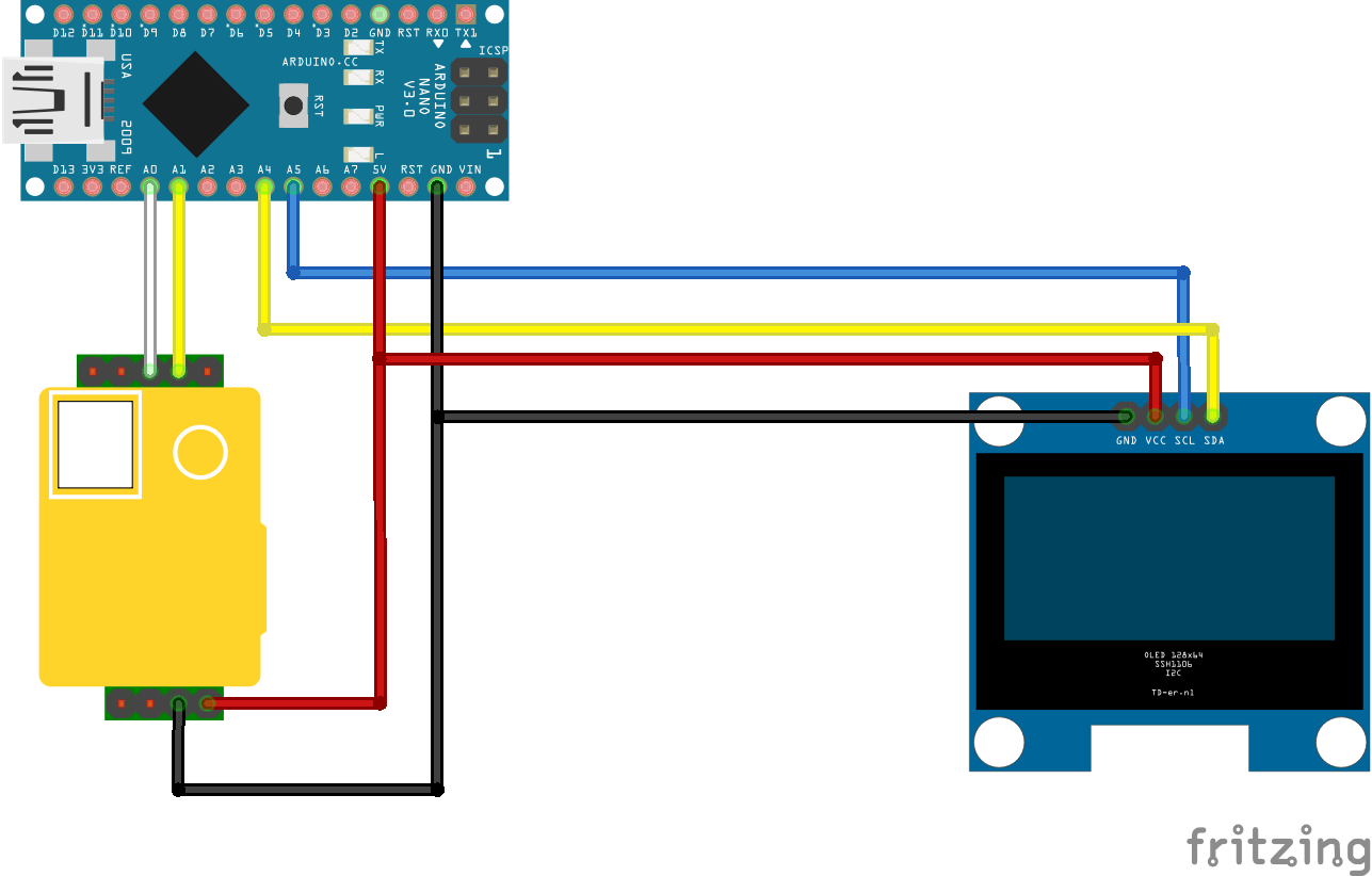 MH-Z19 はソフトウェアによるシリアル接続、OLED ディスプレイは I2C によって接続されます。