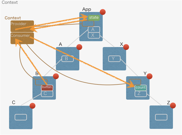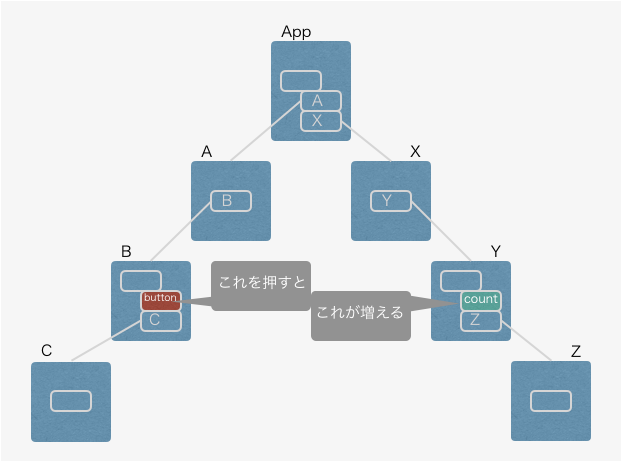 コンポーネント App はコンポーネント A、X を含み、 A、X はそれぞれ B、Y を、 B、Y はそれぞれ C、Z を含みます。 B にはボタンが配置されており、このボタンを押すと、 Y に表示された数字がカウントアップされます。