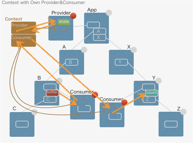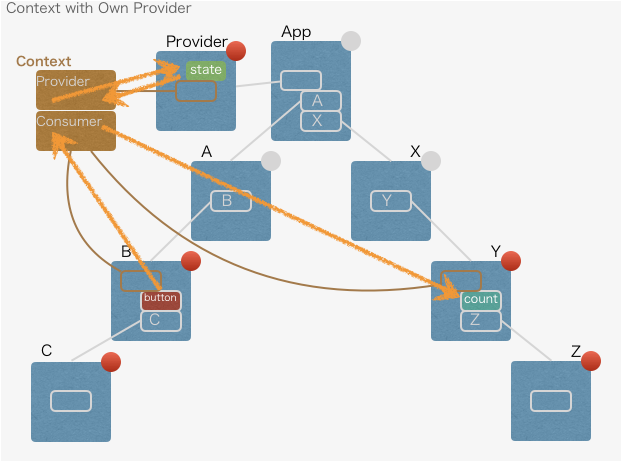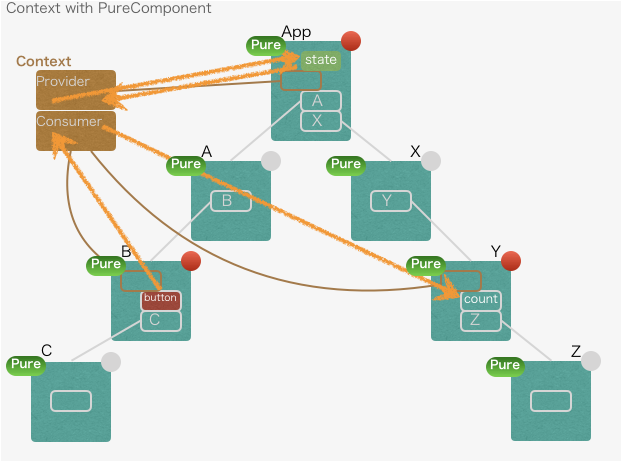 const App = () => <> <A /> <X /> </>; const A = () => <B /> const B = () => <> <button onClick={countUp}>countUp</button> <C /> </> const C = () => </> const X = () => <Y /> const Y = () => <> <div>{count}</div> <Z /> </> const Z = () => </> |