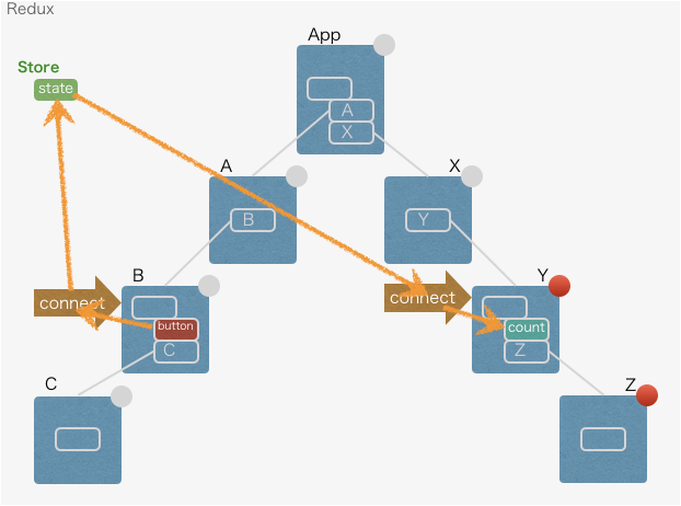 Redux を使うとコンポーネント階層の外に状態を持つことができるため、 connect() より下位のコンポーネントのみ render() が呼ばれることになります。