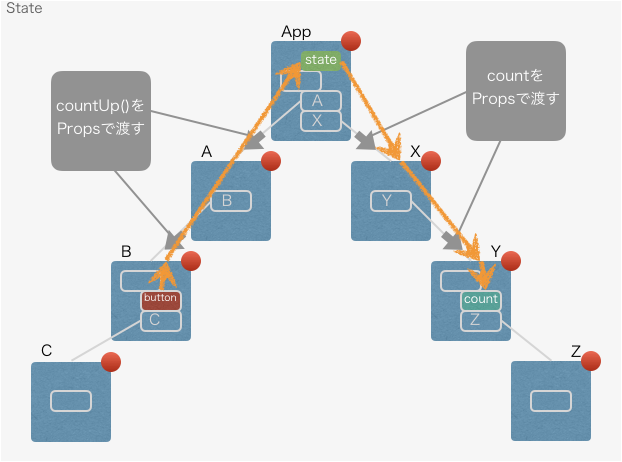 「値の操作に関するコンポーネント B」と「値の表示に関するコンポーネント Y」、両者の共通の祖先である App に State を保持します。 State を操作する countUp() と State の値を表す count を Props で下位のコンポーネントへと渡します。