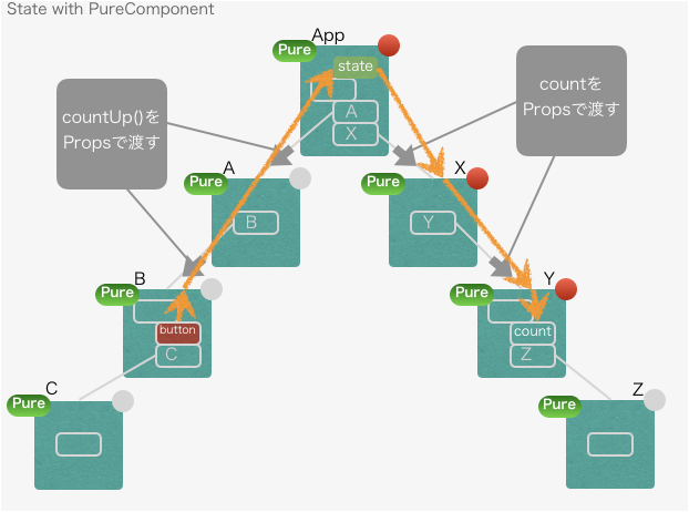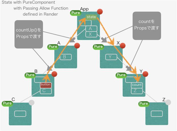 PureComponent を使った場合でも、 countUp() を Props に渡す際にその場(または render() 内)で作成した関数を渡すと、 render() が実行される毎に異なる値となるため、 A、B の render() も呼ばれてしまいます。