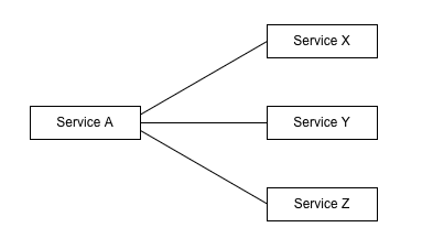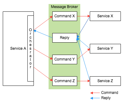 Orchestration では、Service Aで生成したオーケストレーターが、実行するローカルトランザクションコマンドを各サービス(Service X、Y、Z)に通知します。オーケストレーターは実行するローカルトランザクションのインターフェースについて知識を持つ必要があります。