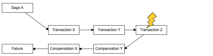 この場合、Transaction Zが失敗したため、補償トランザクション(Compensation Transaction)をすでにコミット済みのTransaction Y、Transaction Xに対して実行します。Saga Aとしては失敗となります。