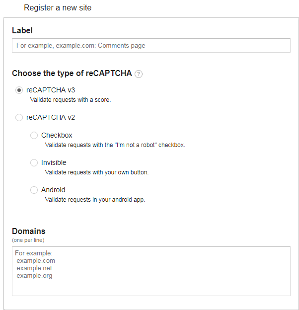 reCAPTCHAのページから「reCAPTCHA v3」を適用するサイトを登録し、キーを取得します。この辺はこれまでのreCAPTCHAと変わりません。