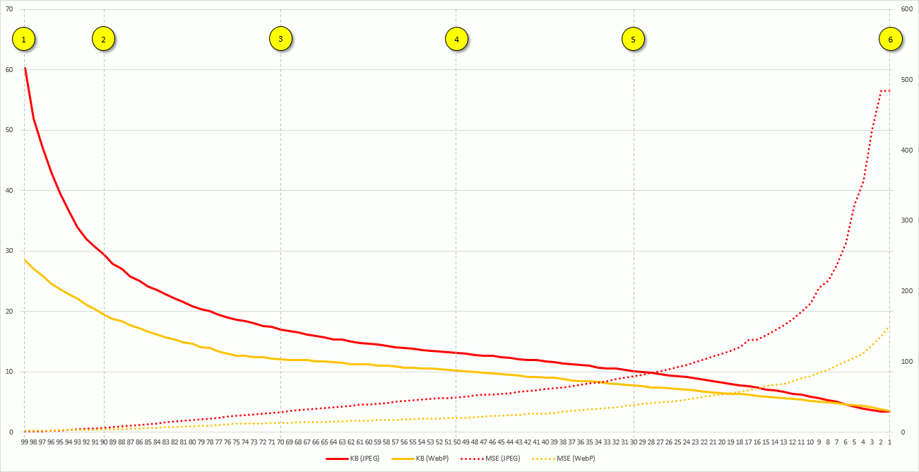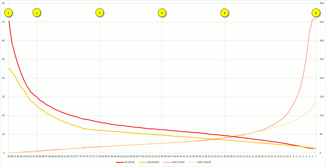 また、横軸が JPEG / WebP のエンコード品質(99 ~ 1)、縦の主軸 + 実線がファイルサイズ、縦の第二軸 + 点線が元画像からの劣化の度合い(元の画像に対する輝度の平均二乗誤差)です。