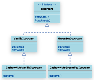 Icecream ice1 = new CashewNutsToppingIcecream(new VanillaIcecream()); Icecream ice2 = new CashewNutsToppingIcecream(new GreenTeaIcecream()); Icecream ice3 = new SliceAlmondToppingIcecream(new CashewNutsToppingIcecream(new VanillaIcecream()));