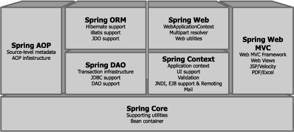 - JDO, Hibernate, iBatis 等の object/relational mapping API を統合するレイヤを提供します。ORM モジュールを使用することで O/R マッパを Spring の他の機能と組み合わせて使用できるようになります。