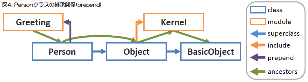 # prependの継承関係を確認 module Greeting # ..... end class Person prepend Greeting end # 継承関係を表示 Person.ancestors #=> [Greeting, Person, Object, Kernel, BasicObject]