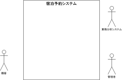 それでは、宿泊予約システムをユースケース図で表してみましょう。以下のようになります。対象であるシステムは、四角形で表します。「宿泊予約システム」など、対象の名前を上部に記述します。