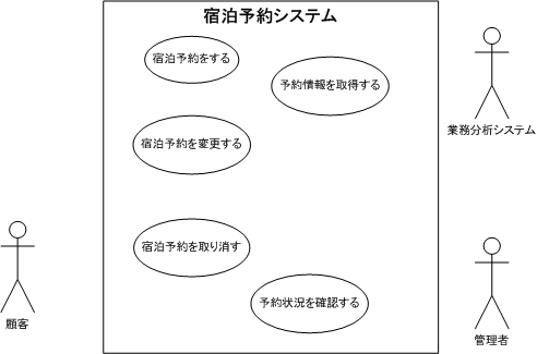 これで、ユースケース図の完成です。2.2で宿泊予約システムを文章で説明していますが、ユースケース図で表現した場合と比べてみてください。